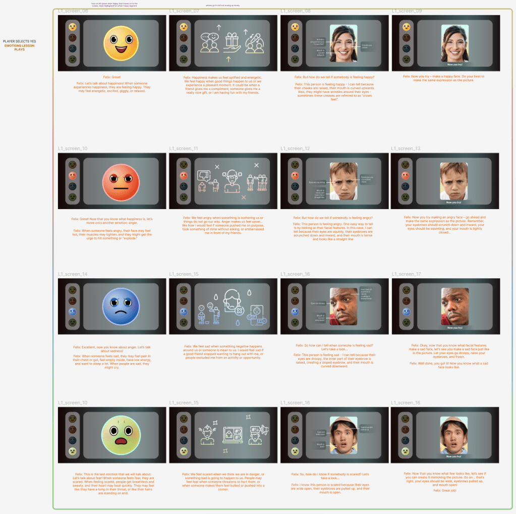 The application was is played across four separate sessions, each structured in a similar way to each other. Impact VR involved a player-centric approach to better teach children facial recognition and emotions. The content provided by VCU needed to be organized and iterated into manageable parts for the experience and user interface. There also needed to be visual consistency between each part, from the assessments to the ending mini game.