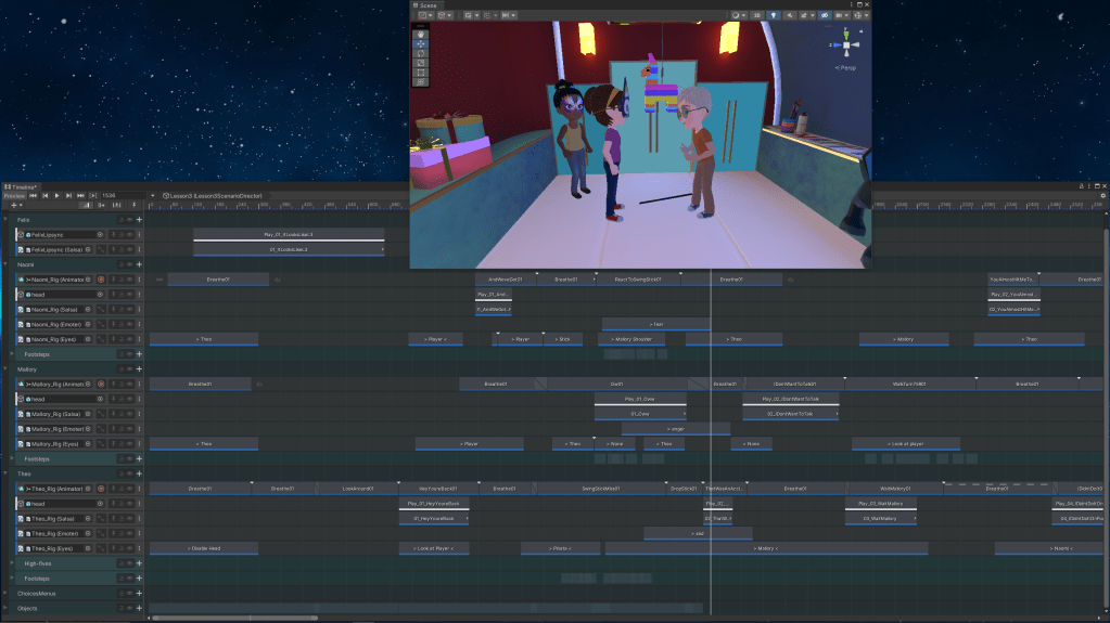 Another important part of the project was the lip synchronization of the characters speaking along with their voice lines, as well as eye and look control. This was done with a lip sync suite program called SALSA and consisted of coordinating triggers with the Timeline tool to control where and when the character would change their gaze as well as what emotion the character would display on their face.