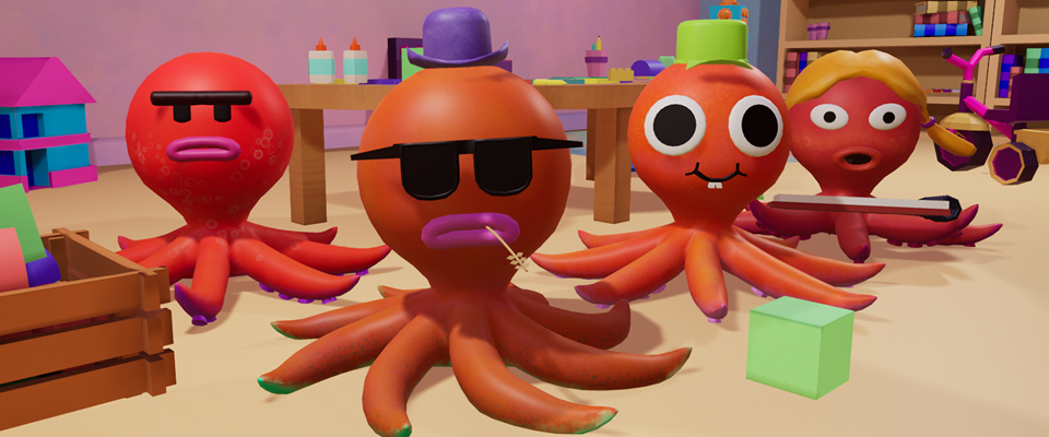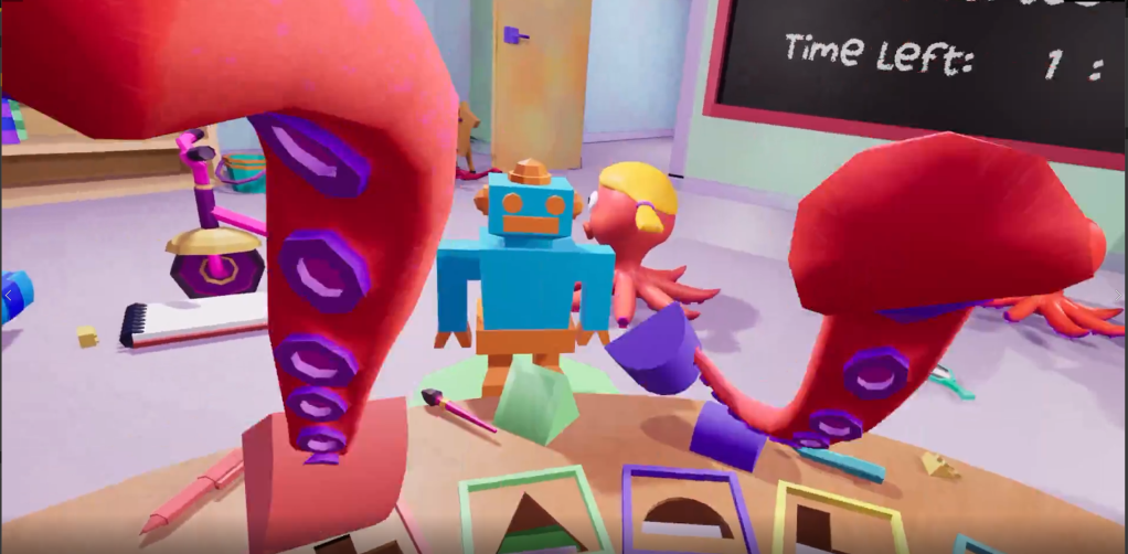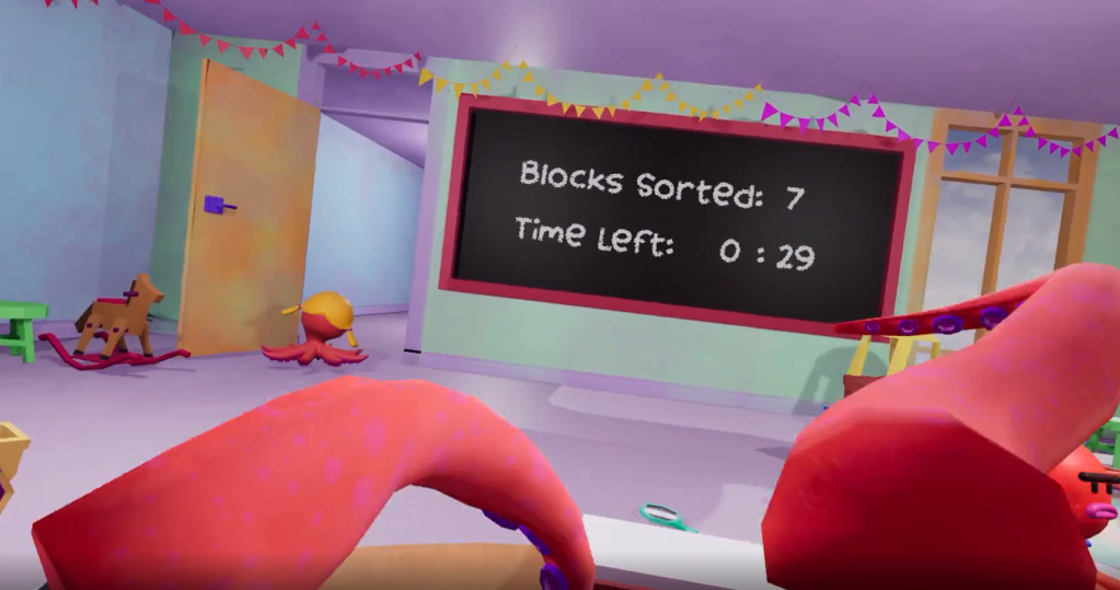 The objective of Blocktopus is to sort as many blocks as possible in two minutes while dealing with the classmates wandering around impeding the player’s progress.