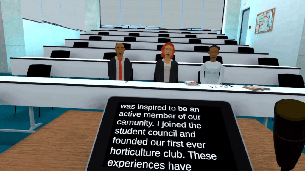 The other two scenarios I had heavy involvement in were the animal scenario and social fear scenario, where I was the timeline editor for both. For social fear, the client wanted the users to have virtual judges pop into the room. To achieve this, I developed a mock mic check to fool the user into thinking they were being recorded and messages that showed when each judge would log in or off.