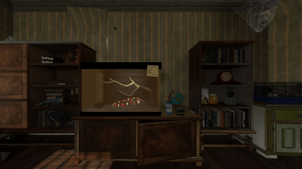 - Fear of harmless insects and animals – a friend has tasked the user with checking on their pets. The participant is placed in an old, decaying house with roaches, a tarantula, bird, mice, and dogs. Each make noise and become active throughout the experience.